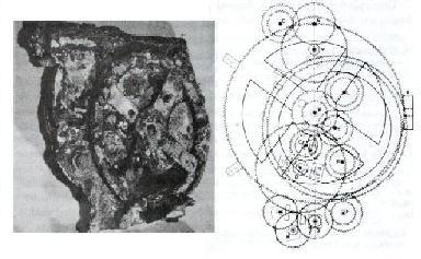 Аналоговый компьютер найден на одном из затонувших кораблей в Эгейском море в 100 году до н.э. Левая часть фотографии содержит изображение находки, а нижняя - чертёж механизма. Возникает вопрос: может быть современные компьютеры вовсе не были изобретены в XIX веке, а являются последствием находки в Эгейском море? Это наталкивает на следующий вопрос: Кто же тогда из нас умнее: мы или наши предки?